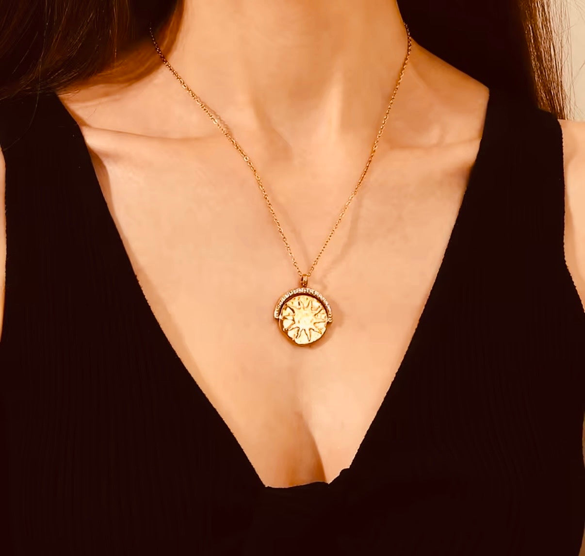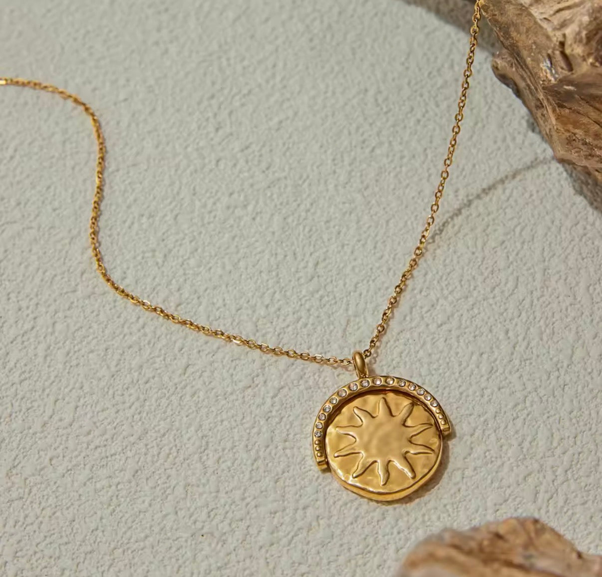 Material: Stainless Steel, One side of the pendant is a Sun and the other side is a Moon.